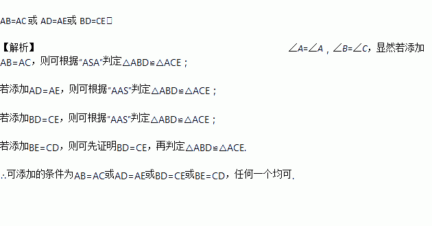 如图,已知∠B=∠C,添加一个条件使△ABD≌△ACE(不标注新的字母,不添加新的线段),你添加的条件是______.