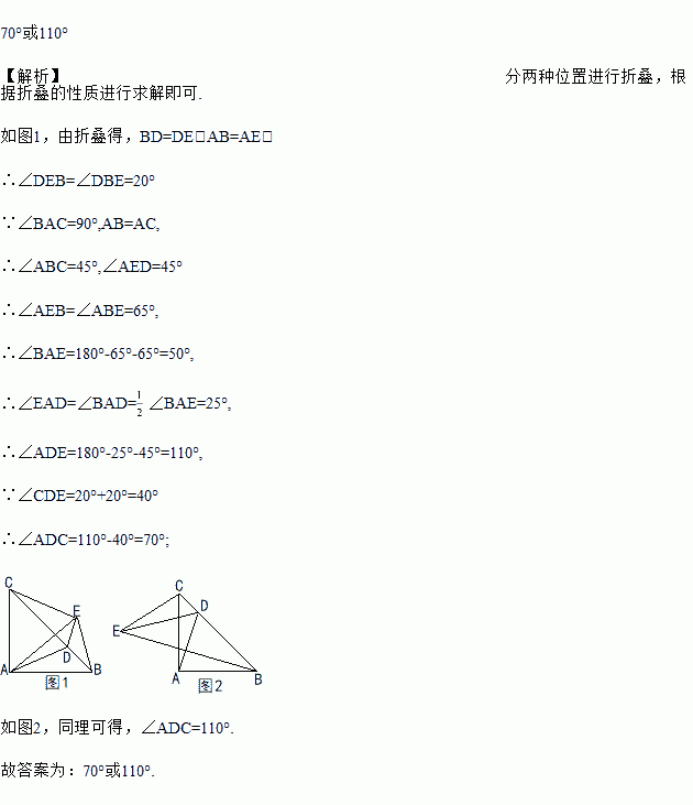 在△ABC中,∠BAC=90°,AB=AC,点D在BC边上,把△ABD沿AD折叠后,使得点B落在点E处,连接CE,若∠DBE=20°,则∠ADC=________.