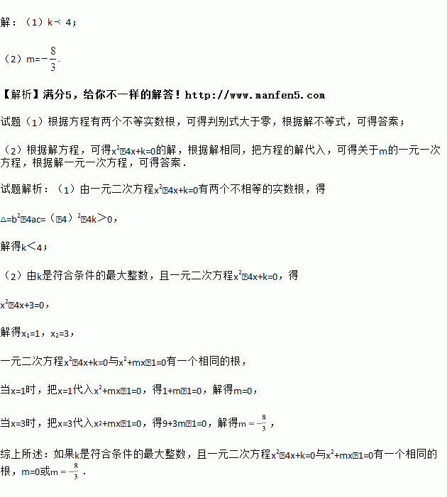 (2)如果k是符合条件的最大整数,且一元二次方程x2﹣4x+k=0与x2+mx﹣1=0有一个相同的根,求此时m的值.