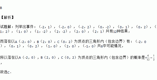(德智外国语期末)如图,一个质地均匀的正四面体上依次标有数字-2,0,1,2,连续抛掷两次,朝下一面的数字分别是a,b,将其作为M点的横、纵坐标,则点M(a,b)落在以A(-2,0),B(2,0),C(0,2)为顶点的三角形内(包括边界)的概率是( )