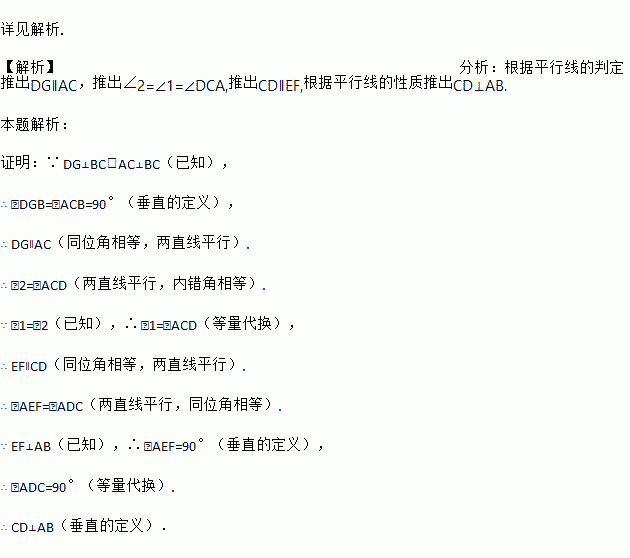 如图,已知DG⊥BC,AC⊥BC,EF⊥AB,∠1=∠2,求证:CD⊥AB
