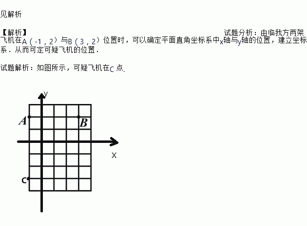 在雷达探测到的区域,可以建立平面直角坐标系来表示位置,在某次行动中,当我方两架飞机在A(-1,2)和B(3,2)的位置,可疑飞机在C(-1,-3)的位置,你能找出这个平面直角坐标系的横、纵坐标轴的位置吗?把它们画出来,并确定可疑飞机的位置.