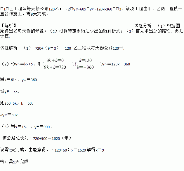 (1)乙工程队每天修公路120米;(2)y甲=60x,y乙=120x-360;(3)该项工程由甲、乙两工程队一直合作施工,需9天完成. 【解析】试题分析:(1)根据图象得出乙每天修的米数;(2)根据待定系数法求出函数解析式;(3)首先求出总的路程,然后计算. 试题解析:(1)∵720÷(9-3)=120∴乙工程队每天修公路120米. (2)设y乙=kx+b,则∴∴y乙=120x-...