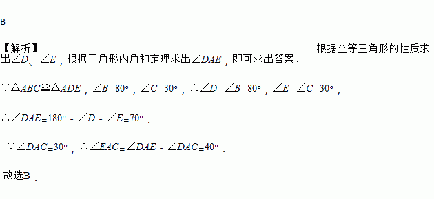 如图,已知△ABC≌△ADE,∠B=80°,∠C=30°,∠DAC=30°,则∠EAC的度数是( )