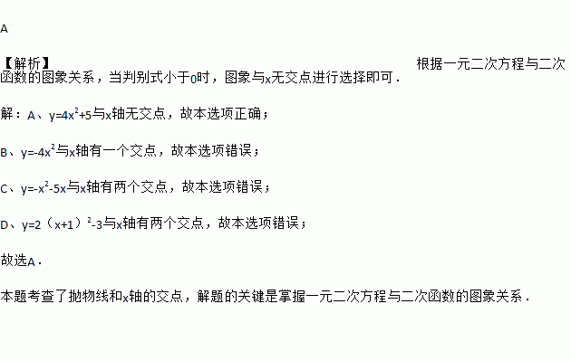 A 【解析】根据一元二次方程与二次函数的图象关系,当判别式小于0时,图象与x无交点进行选择即可. 【解析】 A、y=4x2+5与x轴无交点,故本选项正确; B、y=-4x2与x轴有一个交点,故本选项错误; C、y=-x2-5x与x轴有两个交点,故本选项错误; D、y=2(x+1)2-3与x轴有两个交点,故本选项错误; 故选A. 本题考查了抛物线和x轴的交...
