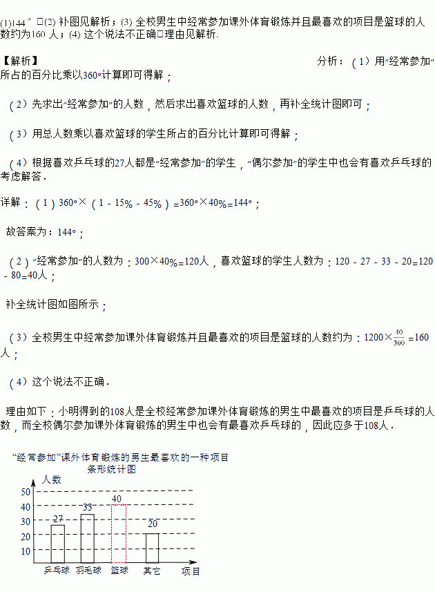 该校共有1200名男生,请估计全校男生中经常参加课外体育锻炼并且最喜欢的项目是篮球的人数;![]()
