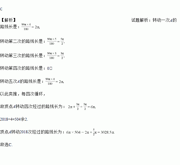 如图,在矩形ABCD中,已知AB=4,BC=3,矩形在直线l上绕其右下角的顶点B向右旋转90°至图中①的位置,再绕右下角的顶点继续向右旋转90°至图中②的位置,…,以此类推,这样连续旋转2018次后,顶点A在整个旋转过程中所经过的路径长之和是 ( )
