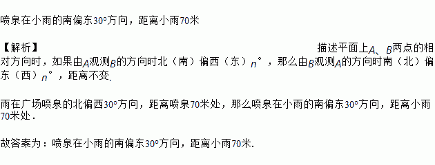 小雨在广场喷泉的北偏西30°方向,距离喷泉70米处,那么喷泉在小雨的_____处.