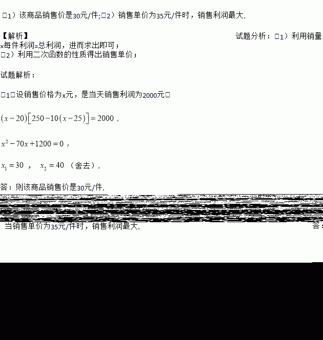 (1)该商品销售价是30元/件;(2)销售单价为35元/件时,销售利润最大. 【解析】试题分析:(1)利用销量×每件利润=总利润,进而求出即可; (2)利用二次函数的性质得出销售单价; 试题解析: (1)设销售价格为x元,是当天销售利润为2000元, . , , (舍去). 答:则该商品销售价是30元/件. (2)设该商品每天的销售利润为y. ...