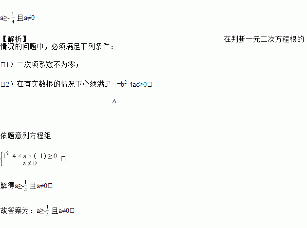 如果关于x的一元二次方程ax2+x-1=0有实数根,则a的取值范围是________.