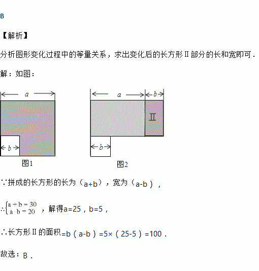 如图①,在边长为a的大正方形中剪去一个边长为b的小正方形,再将图中的阴影部分剪拼成一个长方形,如图②.这个拼成的长方形的长为30,宽为20,则图②中Ⅱ部分的面积是( )