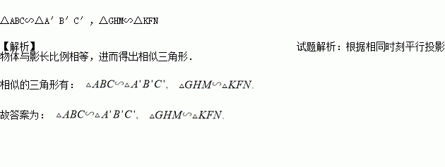 图是木杆、底边上有高的等腰三角形、正方形在同一时刻的影子,其中相似三角形有_____________.