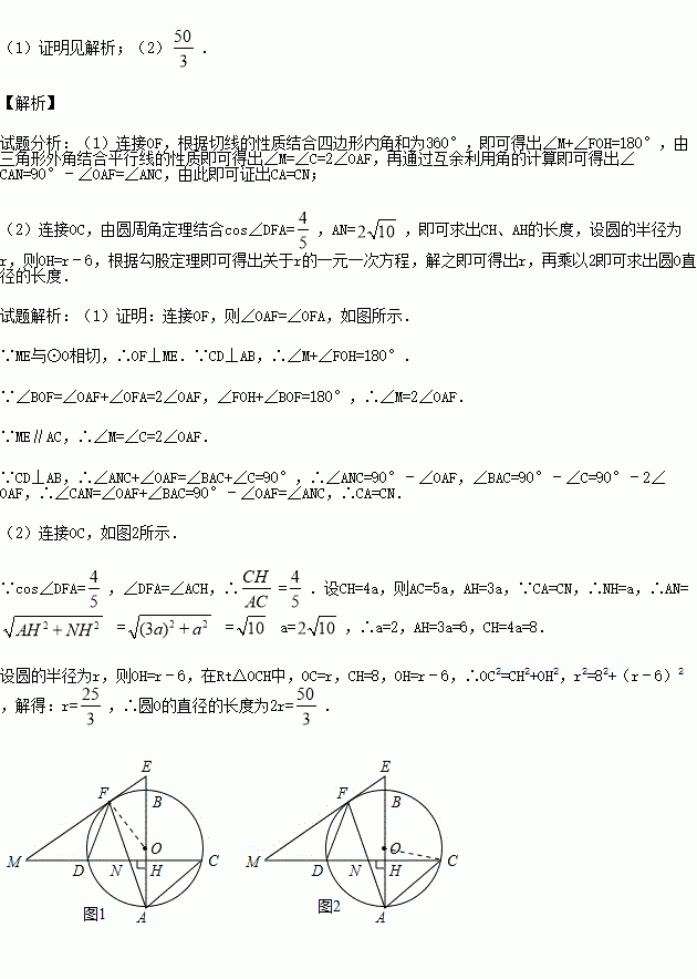如图,已知AB是圆O的直径,弦CD⊥AB,垂足为H,与AC平行的圆O的一条切线交CD的延长线于点M,交AB的延长线于点E,切点为F,连接AF交CD于点N.