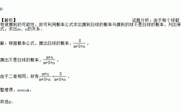 一只盒子中有红球m个,白球8个,黑球n个,每个球除颜色外都相同,从中任取一个球,取得白球的概率与不是白球的概率相同,那么m与n的关系是( )