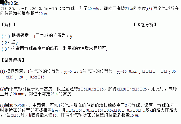 1号探测气球从海拔5 m处出发,以1 m/min的速度上升.与此同时,2号探测气球从海拔15 m处出发,以0.5 m/min的速度上升,两个气球都匀速上升了50 min.设气球上升时间为x min(0≤x≤50).