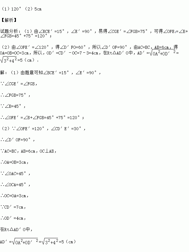 (1)120°(2)5cm 【解析】 试题分析:(1)由∠BCE′=15°,∠E′=90°,易得∠CGE′=∠FGB=75°,可得∠OFE1=∠B+∠FGB=45°+75°=120°; (2)由∠OFE′=∠120°,得∠D′FO=60°,所以∠D′OF=90°,由AC=BC,AB=6cm,得OA=OB=OC=3cm,所以,OD′=CD′﹣OC=7﹣3=4cm,在Rt△AD′O中...