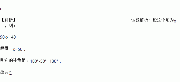 C 【解析】试题解析:设这个角为x°,则: 90-x=40, 解得:x=50, 则它的补角是:180°-50°=130°. 故选C.