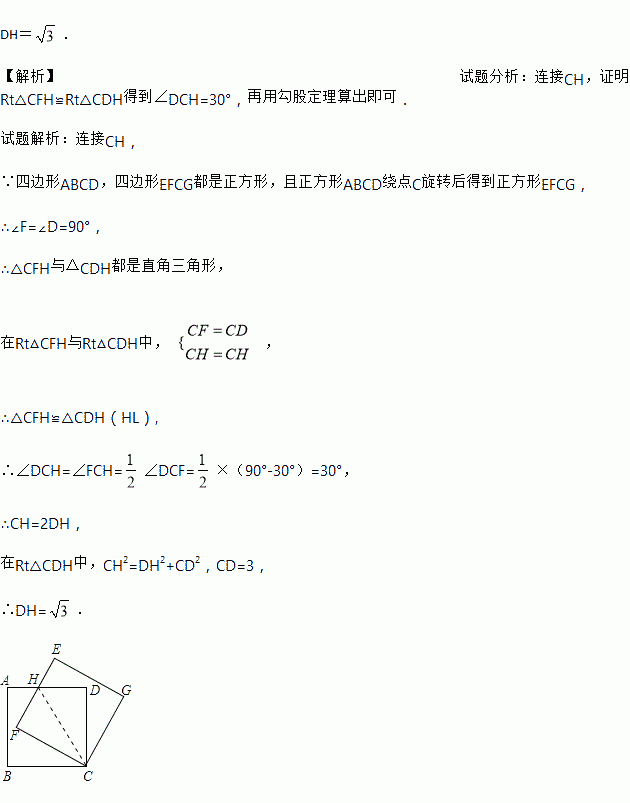如图,边长为3的正方形ABCD绕点C按顺时针方向旋转30°后,得到正方形EFCG,EF交AD于H,求DH的长.