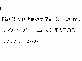 如图,在菱形ABCD中,AB=3,∠ABC=60°,则对角线AC=【 】