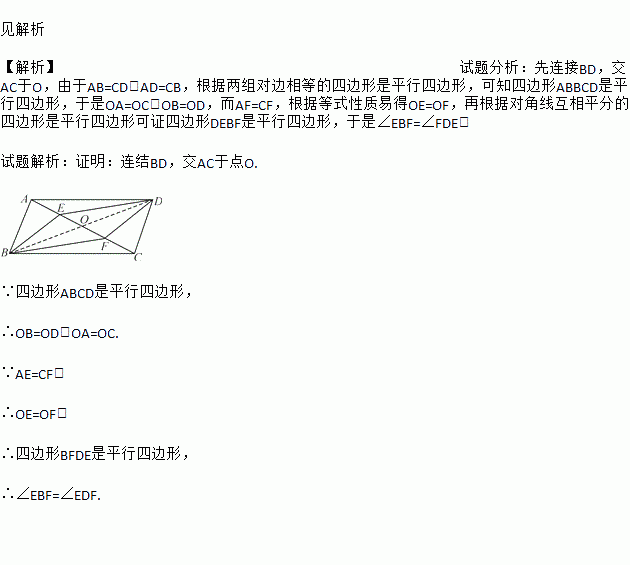 已知:如图,在平行四边形ABCD中,E、F是对角线AC上的两点,且AE=CF.求证:∠EBF=∠EDF.