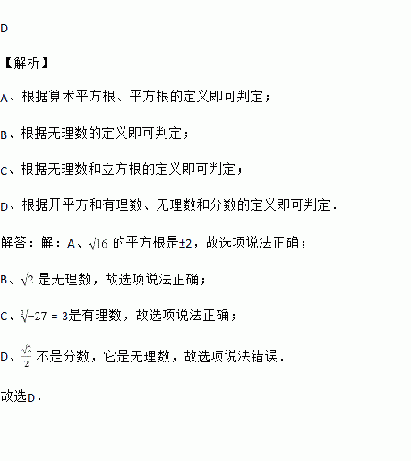 A. 的平方根是±2 B. 是无理数 C. 是有理数 D. 是分数