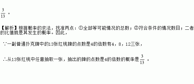 把一副普通扑克牌中的13张红桃洗匀后正面向下,从中任意抽取一张,抽出的牌的点数是4的倍数的概率是 。