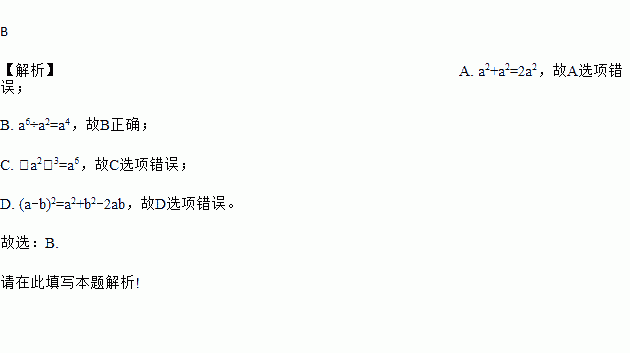 A. a2+a2=a4 B. a6÷a2=a4 C. (a2)3=a5 D. (a﹣b)2=a2﹣b2