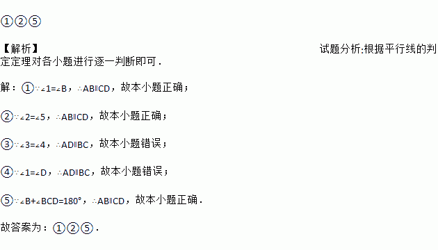 如图,现给出下列条件:①∠1=∠B,②∠2=∠5,③∠3=∠4,④∠1=∠D,⑤∠B+∠BCD=180°,其中能够得到AB∥CD的条件是_______.