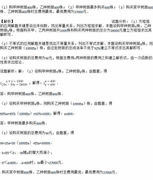 (1)购甲种树苗400株,乙种树苗600株;(2)甲种树苗最多购买600株;(3)购买家中树苗600株.乙种树苗400株时总费用最低,最低费用为27000元. 【解析】试题分析:(1)方程组的应用解题关键是设出未知数,找出等量关系,列出方程组求解.本题设购甲种树苗x株,乙种树苗y株,根据购买甲、乙两种树苗共1000株和购买两种树苗的总价为28000元建立方程组求出其解即可. (2)不等...