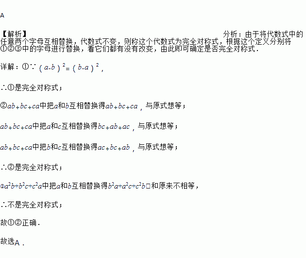 若将代数式中的任意两个字母互相替换,代数式不变,则称这个代数式为完全对称式、如在代数式a+b+c中,把a和b互相替换,得b+a+c;把a和c互相替换,得c+b+a;把b和c…;a+b+c就是完全对称式、下列三个代数式:①(a﹣b)2;②ab+bc+ca;③a2b+b2c+c2a其中为完全对称式的是( )