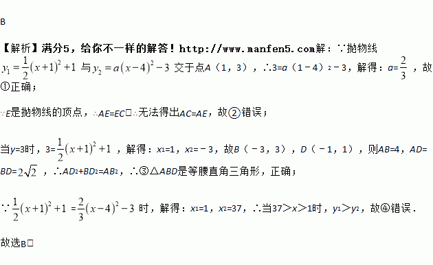 (x+1)2+1与y2=a(x﹣4)2﹣3交于点A(1,3),过点A作x轴的平行线,分别交两条抛物线于B、C两点,且D、E分别为顶点.则下列结论:①a=