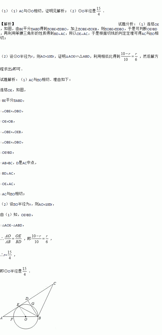 如图,在△ABC中,AB=BC,D是AC中点,BE平分∠ABD交AC于点E,点O 是AB上一点,⊙O过B、E两点,交BD于点G,交AB于点F.