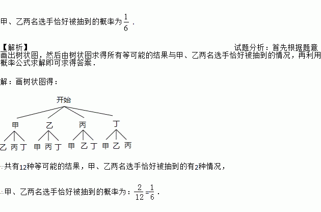 甲、乙两名选手恰好被抽到的概率为. 【解析】试题分析:首先根据题意画出树状图,然后由树状图求得所有等可能的结果与甲、乙两名选手恰好被抽到的情况,再利用概率公式求解即可求得答案. 【解析】 画树状图得: ∵共有12种等可能的结果,甲、乙两名选手恰好被抽到的有2种情况, ∴甲、乙两名选手恰好被抽到的概率为:=.