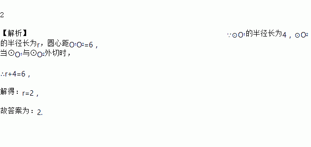 已知⊙O1的半径长为4,⊙O2的半径长为r,圆心距O1O2=6,当⊙O1与⊙O2外切时,r的长为_____.