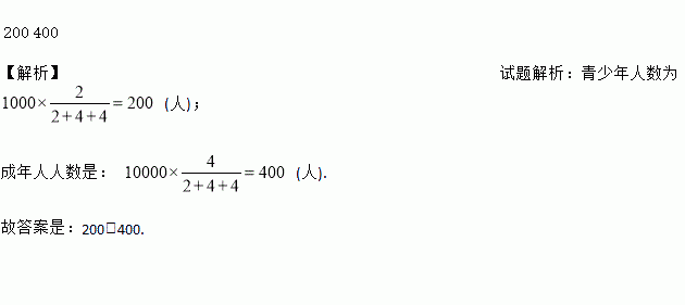 如果某地青少年、成年人、老年人的人口比为2:4:4.现要抽取一个样本容量为1000的样本,青少年人数为__人,成年人人数为__人.