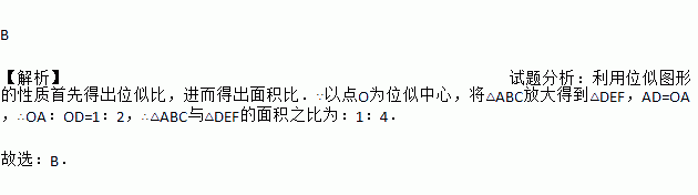 如图,以点O为位似中心,将△ABC放大得到△DEF,若AD=OA,则△ABC与△DEF 的面积之比为 ( )