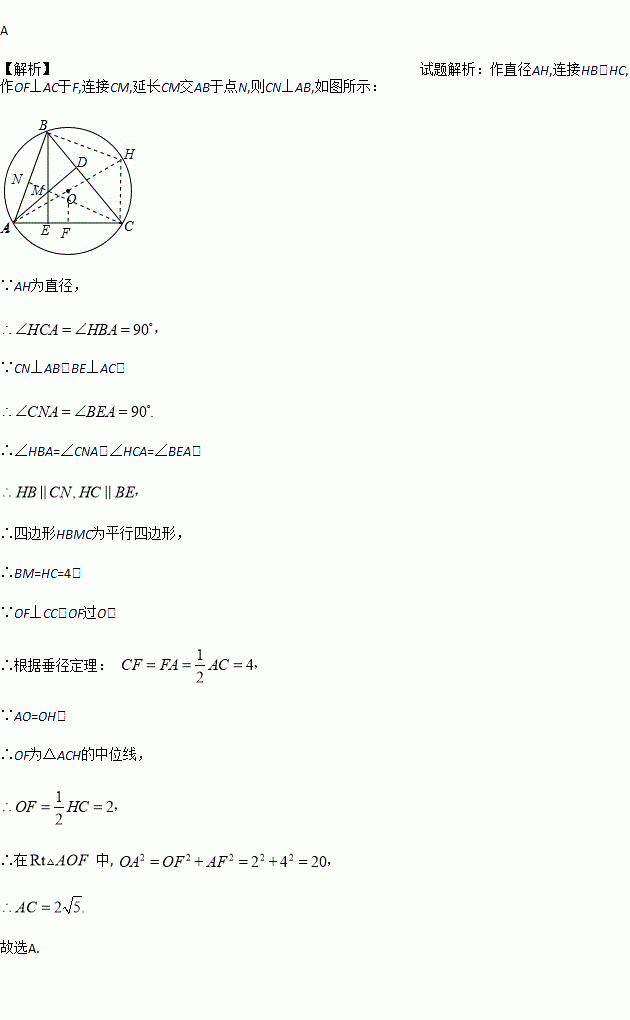 如图,△ABC内接于⊙O,AD⊥BC, BE⊥AC,AD,BE相交于点M,若AC=8,BM=4,则⊙O 的半径等于( )