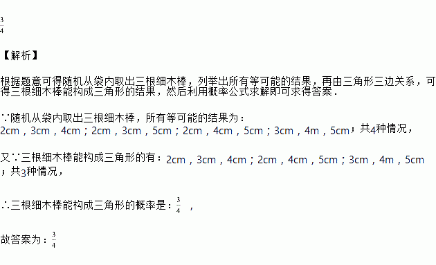 一口袋中装有四根长度分别为,,,的细木棒,现随机从袋内取出三根细木棒,则三根细木棒能构成三角形的概率是________.