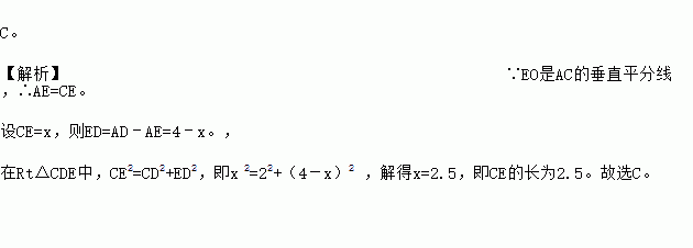 如图,在矩形ABCD中,AB=2,BC=4,对角线AC的垂直平分线分别交AD、AC于点E、O,连接CE,则CE的长为【 】