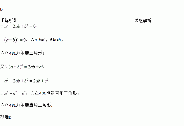 若a,b,C是△ABC的三条边,且满足a2﹣2ab+b2=0,(a+b)2=2ab+c2 , 则△ABC的形状为( )