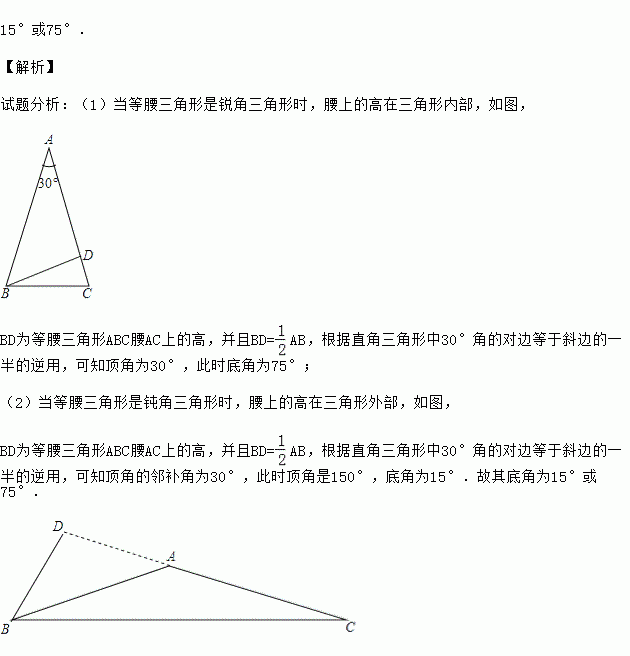 15°或75°. 【解析】 试题分析:(1)当等腰三角形是锐角三角形时,腰上的高在三角形内部,如图, BD为等腰三角形ABC腰AC上的高,并且BD=AB,根据直角三角形中30°角的对边等于斜边的一半的逆用,可知顶角为30°,此时底角为75°; (2)当等腰三角形是钝角三角形时,腰上的高在三角形外部,如图, BD为等腰三角形ABC腰AC上的高,并且BD=AB,根据直角三...