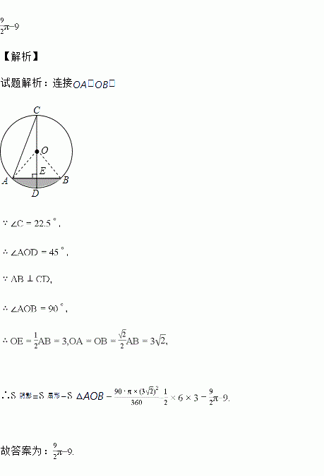 如图,在⊙O中,CD是直径,弦AB⊥CD,垂足为E,若∠C=22.5°,AB=6cm,则阴影部分面积为_____.