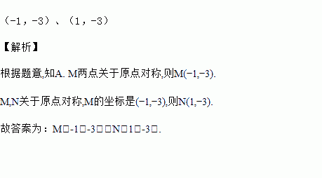 如图,阴影部分组成的图案既是关于x轴成轴对称的图形,又是关于坐标原点O成中心对称的图形. 若点A的坐标为(1,3),则点M和点N的坐标分别为M__________,N _________.