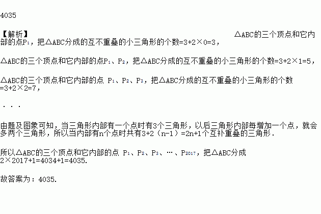 Èçͼ£¬¡÷ABCµÄÈý¸ö¶¥µãºÍËüÄÚ²¿µÄµãP1£¬°Ñ¡÷ABC·Ö³É3¸ö»¥²»ÖصþµÄСÈý½ÇÐΣ»¡÷ABCµÄÈý¸ö¶¥µãºÍËüÄÚ²¿µÄµãP1¡¢P2£¬°Ñ¡÷ABC·Ö³É5¸ö»¥²»ÖصþµÄСÈý½ÇÐΣ»¡÷ABCµÄÈý¸ö¶¥µãºÍËüÄÚ²¿µÄµã P1¡¢P2¡¢P3£¬°Ñ¡÷ABC·Ö³É7¸ö»¥²»ÖصþµÄСÈý½ÇÐΣ»¡¡÷ABCµÄÈý¸ö¶¥µãºÍËüÄÚ²¿µÄµã P1¡¢P2¡¢P3¡¢¡¡¢P2017£¬°Ñ¡÷ABC·Ö³É_____¸ö»¥²»ÖصþµÄСÈý½ÇÐΣ®