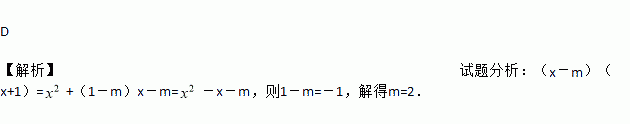 D 【解析】试题分析:(x-m)(x+1)=+(1-m)x-m=-x-m,则1-m=-1,解得m=2.