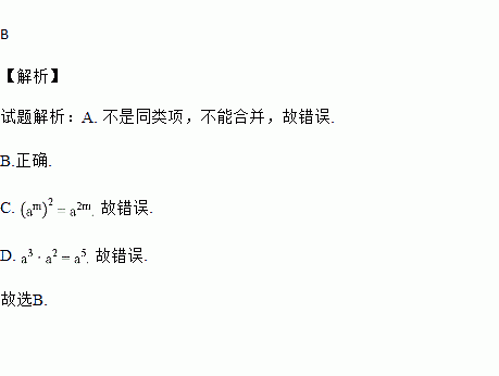 A. a+2a=3a2 B. (a2b)3=a6b3 C. (am)2=am+2 D. a3•a2=a6