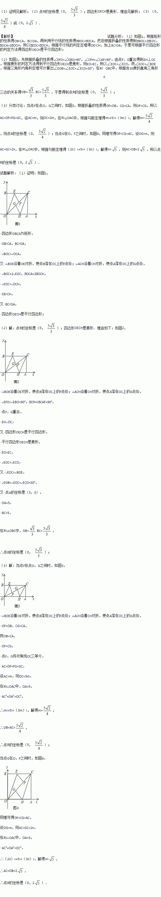 如图1,已知O是坐标原点,点A的坐标是(5,0),点B是y轴正半轴上一动点,以OB,OA为边作矩形OBCA,点E,H分别在边BC和边OA上,将△BOE沿着OE对折,使点B落在OC上的F点处,将△ACH沿着CH对折,是点A落在OC上的G点处。