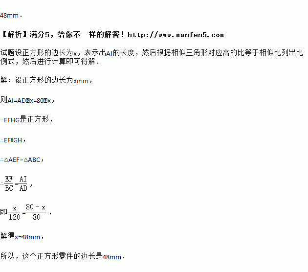 如图,△ABC是一块锐角三角形余料,边BC=120mm,高AD=80mm,要把它加工成正方形零件,使一边在BC上,其余两个顶点分别在边AB、AC上,那么这个正方形的边长是多少?