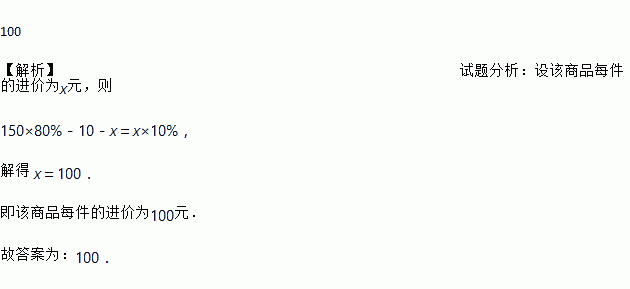 100 【解析】试题分析:设该商品每件的进价为x元,则 150×80%-10-x=x×10%, 解得 x=100. 即该商品每件的进价为100元. 故答案为:100.