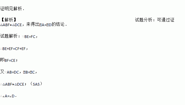 如图,点E、F在BC上,BE=FC,AB=DC,∠B=∠C.求证:∠A=∠D.